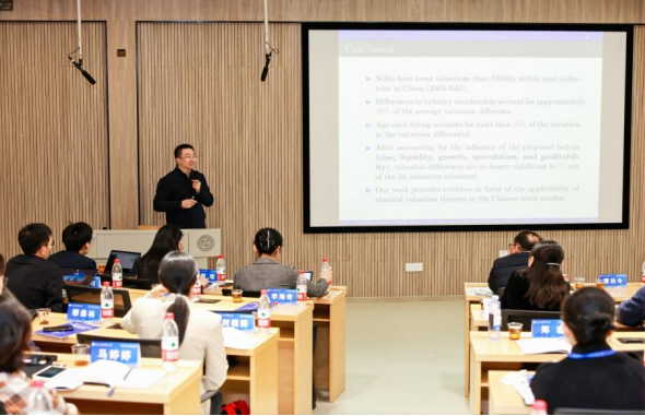 主题报告第一阶段,四位知名专家主要围绕“数智技术驱动的金融风险研究”、“气候风险与经济社会系统”、“国有与非国有企业的估值”、“信誉风险:债券违约如何提高信用评级质量”、“绿色金融”等多个主题做了精彩纷呈的大会报告。专家学者的报告内容前沿、视角独特,引发了与会者的热烈讨论和积极互动。