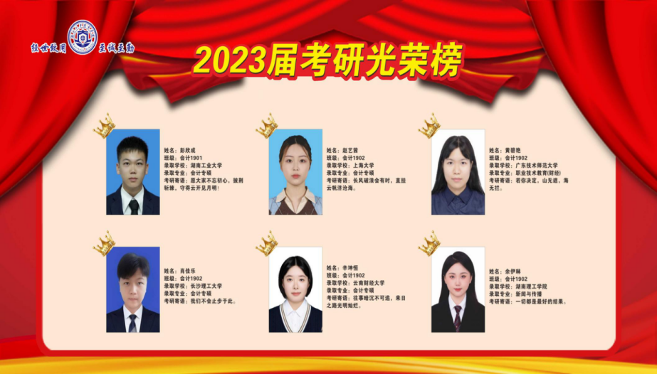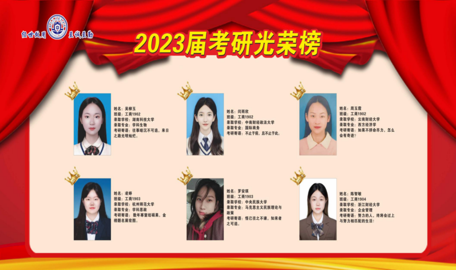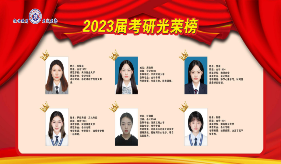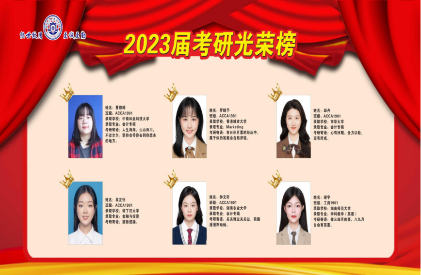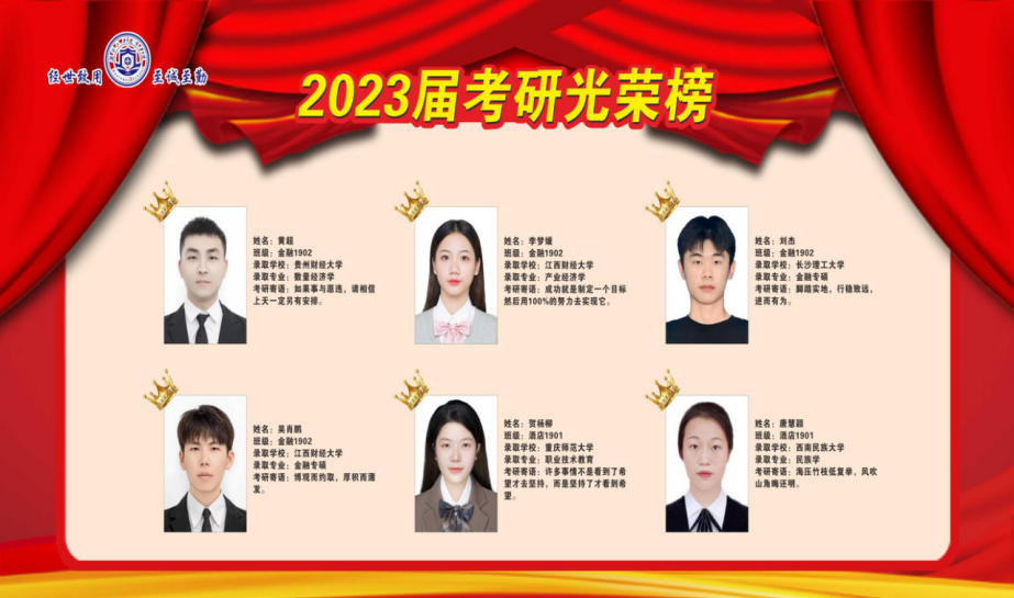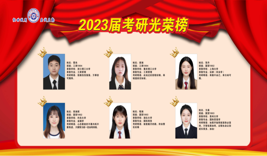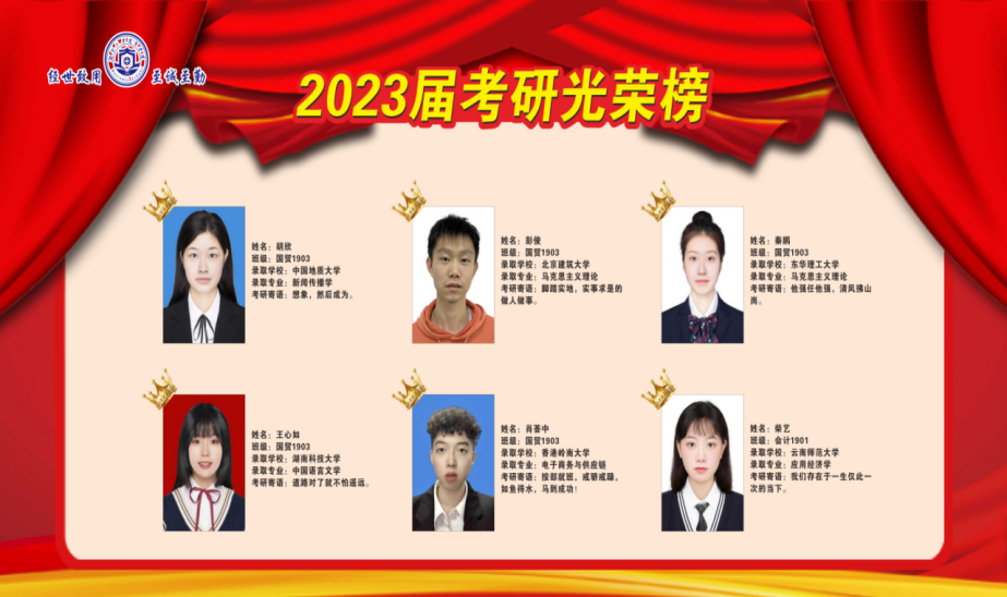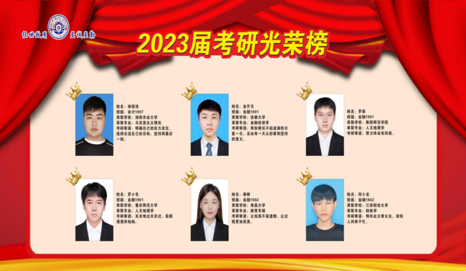 近日,商学院考研学子喜报频传,2023届毕业生在全国硕士研究生考试中,不负众望、再创佳绩,共有49位同学成功录取硕士研究生,其中9人上岸211、985高校(中央民族大学、中南财经政法大学、华南师范大学、湖南师范大学、贵州大学等),与2022届相比,考研录取人数增长88.46%,与2018届历史最好水平比较,增长40%。