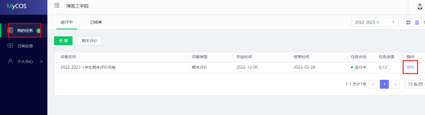 登录后,点击【我的任务】,查看【进行中】任务中的问卷,点击问卷即可参与评价。