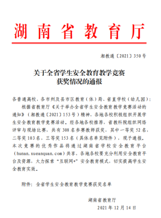 近日,湖南省教育厅公布了2021年湖南省学生安全教育教学竞赛结果,beat365官网教师王津津在欧丽娟教授的指导下的作品《化学品安全》经专家网络评审和现场比赛,在来自全省各级各类学校近500名教师参赛中荣获三等奖。(教学质量监控与评估中心 周斌)