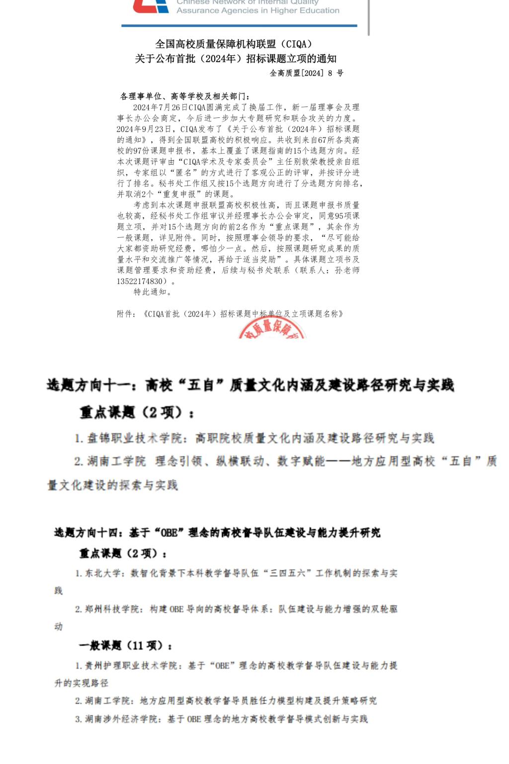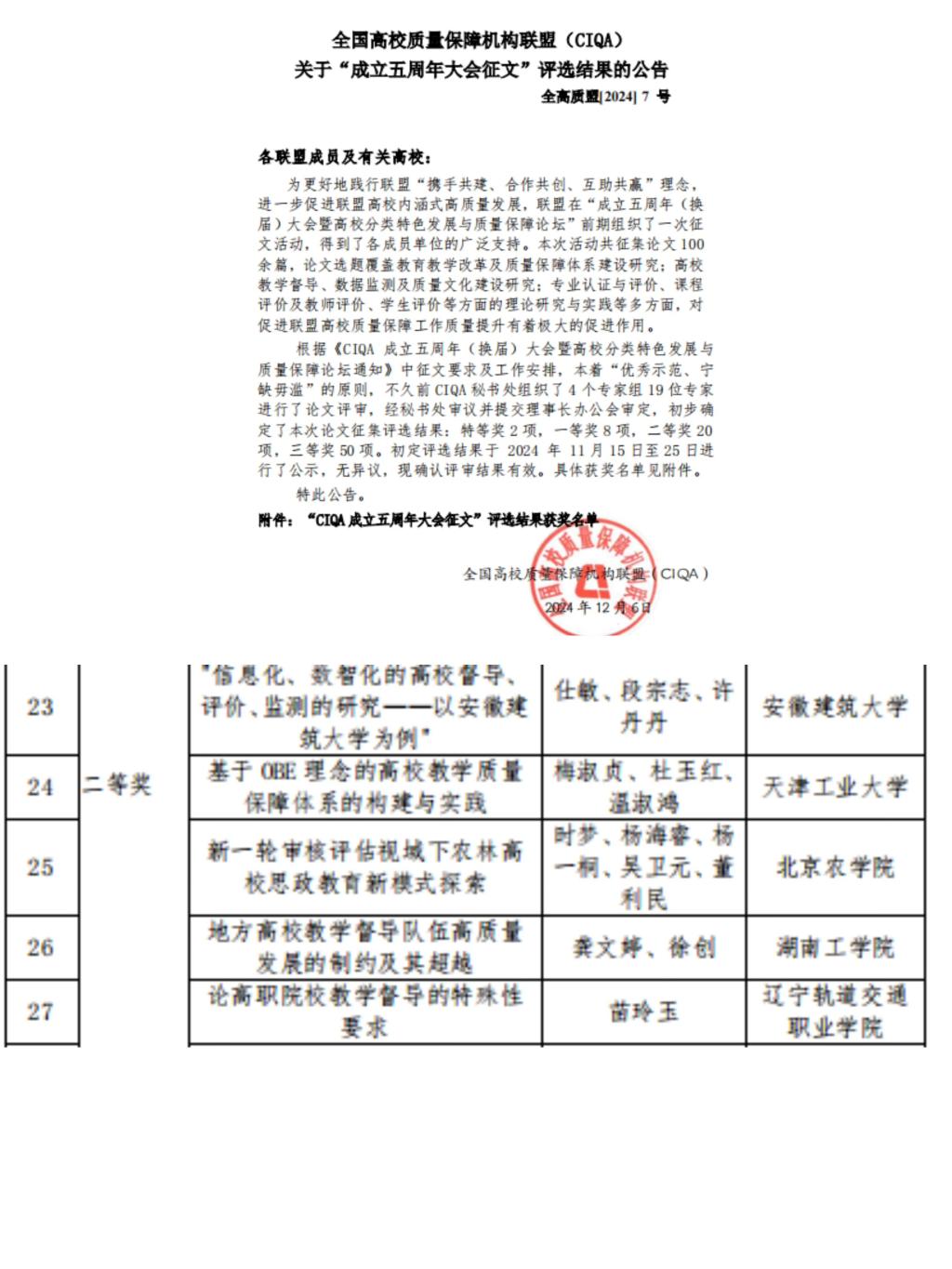 会上公布了CIQA联盟成立五周年大会征文活动获奖论文名单,beat365官网龚文婷、徐创提交的论文《地方高校教学督导队伍高质量发展的制约及其超越》荣获二等奖。会议同时发布了CIQA首批招标课题立项公告,beat365官网获重点课题立项一项,一般课题立项一项。