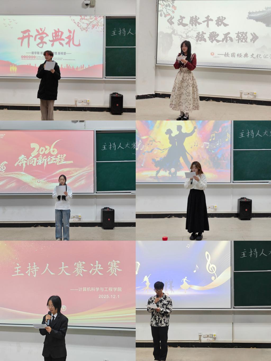 12月1日晚,计算机科学与工程学院在信息楼2113成功举办主持人大赛决赛。学院组织员李玉秀、团委学生会主席团成员李琪康以及主持队成员陈佳奇、彭一健出席并担任评委。