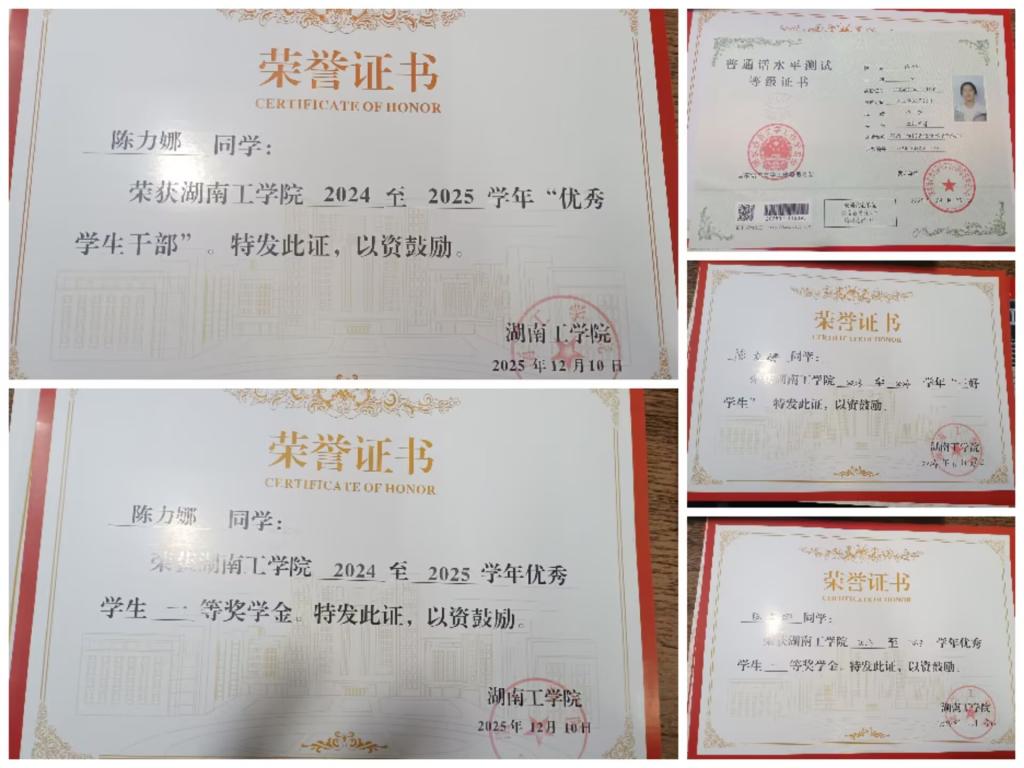 陈佳奇,女,共青团员,计算机科学与工程学院2024级网络工程专业学生。入学以来,以全面发展为目标,勤学笃行、勇于实践、乐于奉献,先后荣获第十六届“挑战杯”湖南省大学生课外学术科技作品竞赛省级三等奖、全国大学生创新发明大赛・互联网英语听说挑战赛湖南省三等奖,并取得普通话等级证书、大学英语四级证书等多项技能证书。
