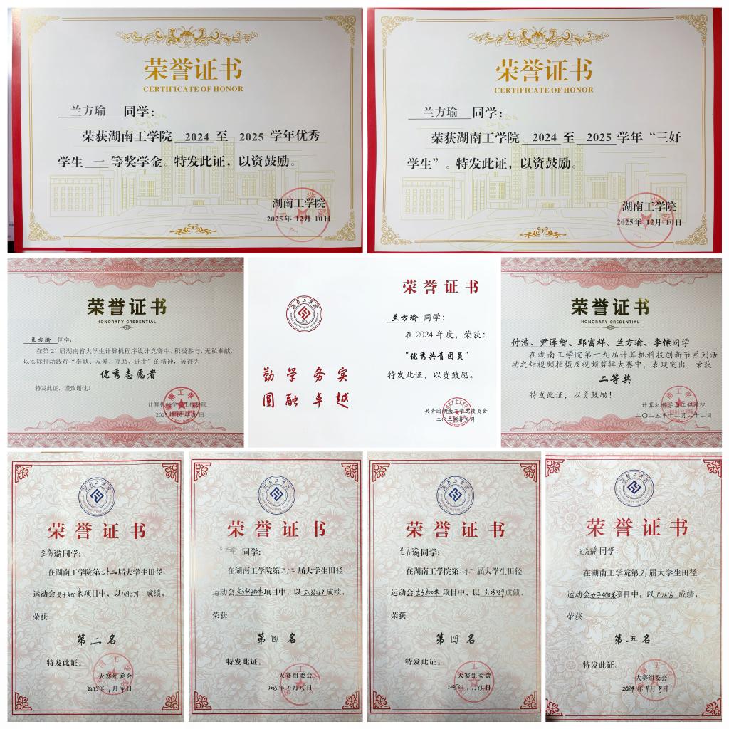 谢彬华,女,计算机科学与工程学院2023级计算机科学与技术专业学生,现任班级班长兼学习委员。2024-2025学年表现突出,获多项荣誉:思想上,2024年度荣获“优秀共青团员”称号,大一下学期推优为入党积极分子,现为中共预备党员;学业上,学业及综测成绩均列班级第一、专业第二,获校级一等奖学金;科创竞赛上,作为负责人带领团队参与多项科研项目,获大创省级立项,在“互联网+”大赛中获三项校级优胜奖及院级二、三等奖;体育竞赛上,代表学校参加省级体育舞蹈比赛,斩获多项二、三等奖;校园建设中,任校交谊舞协会多职,带领团队完成多项表演,积极参与各类志愿服务;社会实践上,2025年寒暑假参加“青春湘伴·与法同行”送法下乡活动,获株洲市司法局等颁发的法治服务志愿者证书,同时积极参与“三下乡”等社会实践活动。