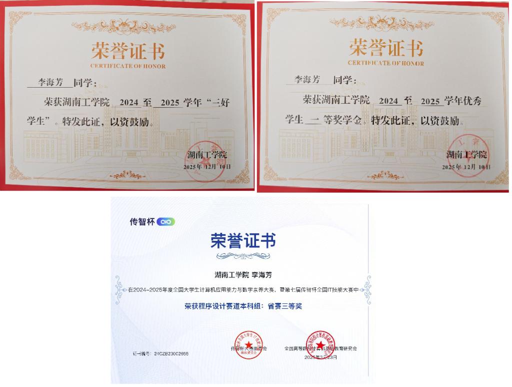 李海芳,女,计算机科学与工程学院2024级计算机科学与技术专业学生。该生严于律己,在思想、学习与实践中实现全面发展,综合表现优异。学习勤奋刻苦,综合成绩位列专业第一,荣获国家励志奖学金、校级一等奖学金及“三好学生”称号;积极参与学科竞赛,获第七届“佳智杯”全国IT技能大赛省赛三等奖、“学生会优秀工作者” 等荣誉,并在多项程序设计赛事中获奖,实践创新能力突出。