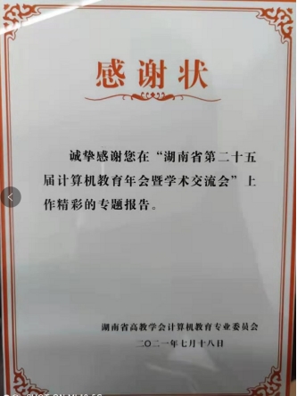 2021年7月18日,由湖南省高教学会计算机教育专业委员会主办,湘南学院承办的湖南省第25届计算机教育年会暨学术交流会在郴州召开,beat365官网计算机基础教研室主任戴成秋应邀参加了本次年会并作了课程教学分享报告。