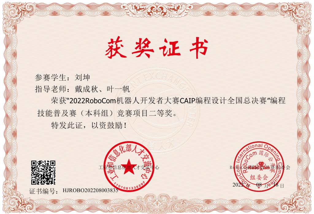 近日,由工业和信息化部人才交流中心、RoboCom国际公开赛组委会共同主办的“2022 RoboCom 机器人开发者大赛CAIP编程设计全国总决赛”(以下简称RoboCom-CAIP)圆满结束。经过全国24个省份160余所高校的选拔,本科组共有1126人进入全国总决赛,通过与众多高校选手的激烈角逐,beat365正版唯一官网必一计算机科学与工程学院ACM集训队取得了国家级二等奖 3 项、国家级三等奖3 项的好成绩,计算机科学与工程学院戴成秋、叶一帆荣获“优秀指导教师”荣誉称号。