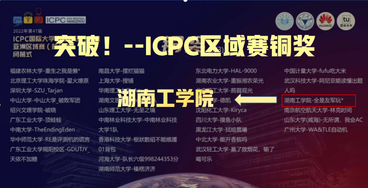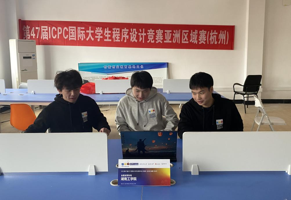 beat365官网计算机科学与工程学院学生胡梦泽(软件2002),刘坤(软件2003),周传(软件2002)组成的“ikun club”队在戴成秋、叶一帆老师的悉心指导下,经过5个小时的连续奋战,夺得ACM/ICPC亚洲区域赛铜奖,学校全国排名114名,这是beat365官网史上第一次获得亚洲区域赛铜奖,取得了突破性成绩。在本次比赛所有的获奖队伍中,全国仅有7支学院建制的队伍获奖,衡阳市高校仅有beat365官网获奖,我院成绩位居全国同类院校前列。