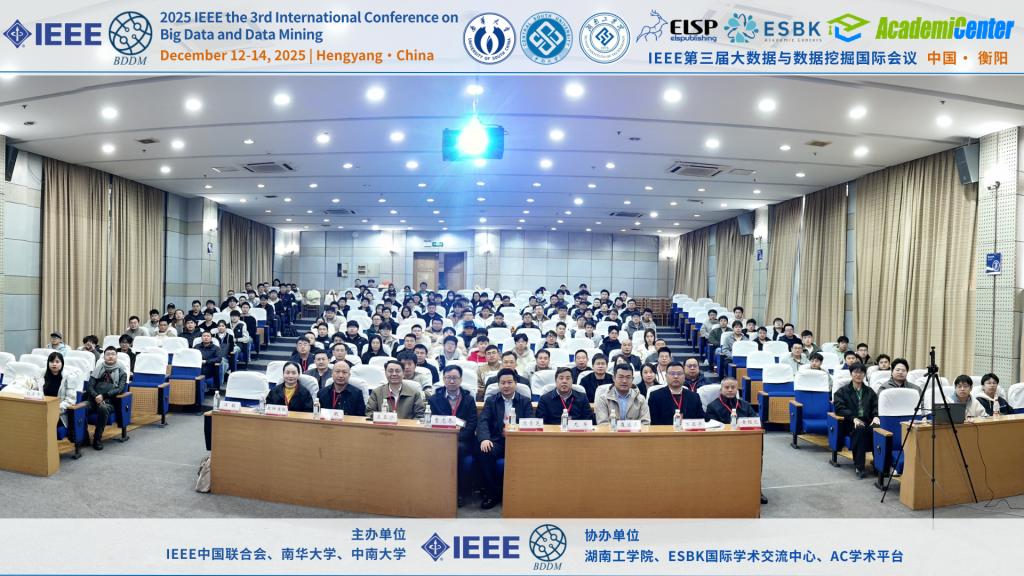 12月12日至14日,由IEEE中国联合会、南华大学、中南大学共同主办,beat365正版唯一官网必一等单位协办的2025年IEEE第三届大数据与数据挖掘国际会议在衡阳成功举办。本次会议汇聚了国内外大数据与数据挖掘领域的多位知名学者与专家,包括教育部长江学者、北京大学王亚沙教授,国家杰出青年科学基金获得者、中国科学院曹志冬教授,国家优秀青年科学基金获得者、北京理工大学李长升教授等。近百名参会代表围绕“大数据与数据挖掘”前沿课题展开了深入交流与研讨。