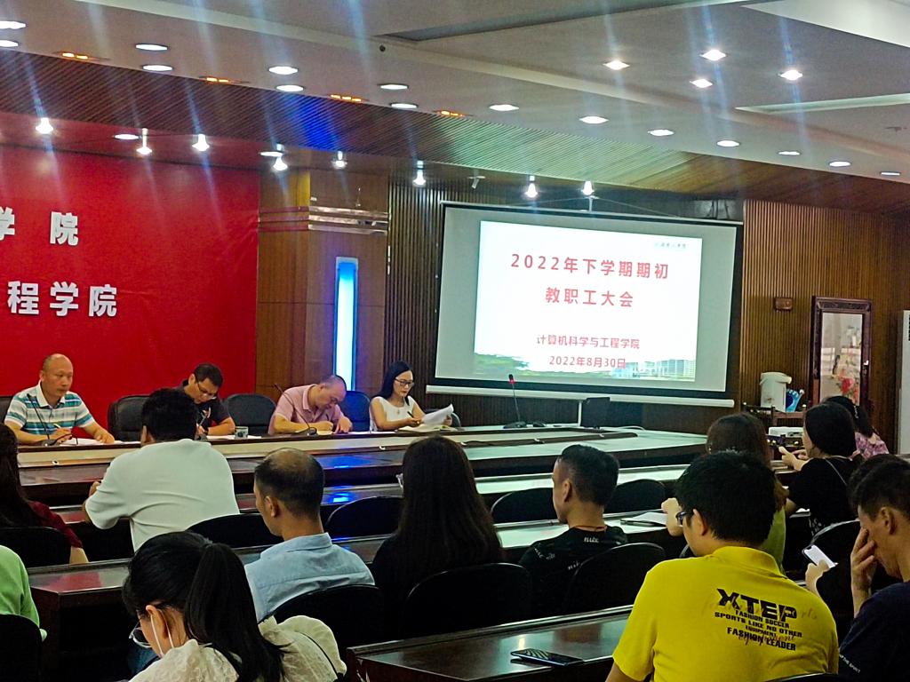 8月30日上午,计算机科学与工程学院在信息楼大会议室2216组织召开2022年下学期期初教职工大会暨”校风、教风、学风”学习,会议由院党委书记黎昂主持,学院党政领导、全体教职工参加了会议。