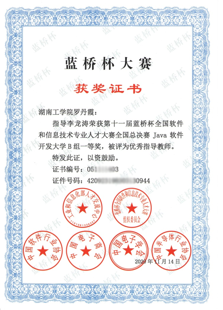 经过多年来的总结与沉淀,2021年在课程组的共同努力下,罗老师取得了湖南省线下一流本科课程立项。同时,她所带的教学班级数据2001班达到了85%的优良率;指导学生参加竞赛,并取得多项佳绩,如全国蓝桥杯总决赛一等奖一项,二等奖一项,全国蓝桥杯湖南赛区大赛一等奖两项等。