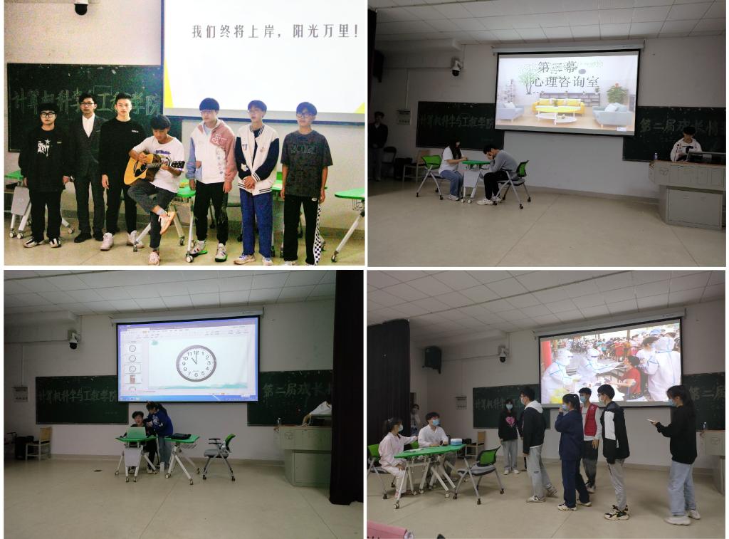 本次共有13支参赛队伍参加比赛,参赛作品内容丰富,选取的题材源于生活并高于生活,既有在亲情、友情感召下重拾生活信心,驱赶抑郁病魔的《抑愈》;也有战胜网瘾,摆脱对网络世界依赖的《时间都去哪了》;还有在面对困难家境,积极向上,勇于拼搏,不负韶华的《奋斗在阳光下》。剧情真实感人,演员们用生动逼真的表演完美诠释了当代大学生如何面对纷繁生活,战胜自我,拥抱健康的心理成长历程。节目凸显出同学们的聪明才智,闪现出现实生活中的亮点,仿佛让人身临其境,赢得了在场观众的阵阵掌声。经过一番激烈的角逐,计科2103班花好月圆队的节目《抑愈》荣获一等奖。