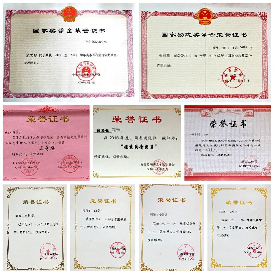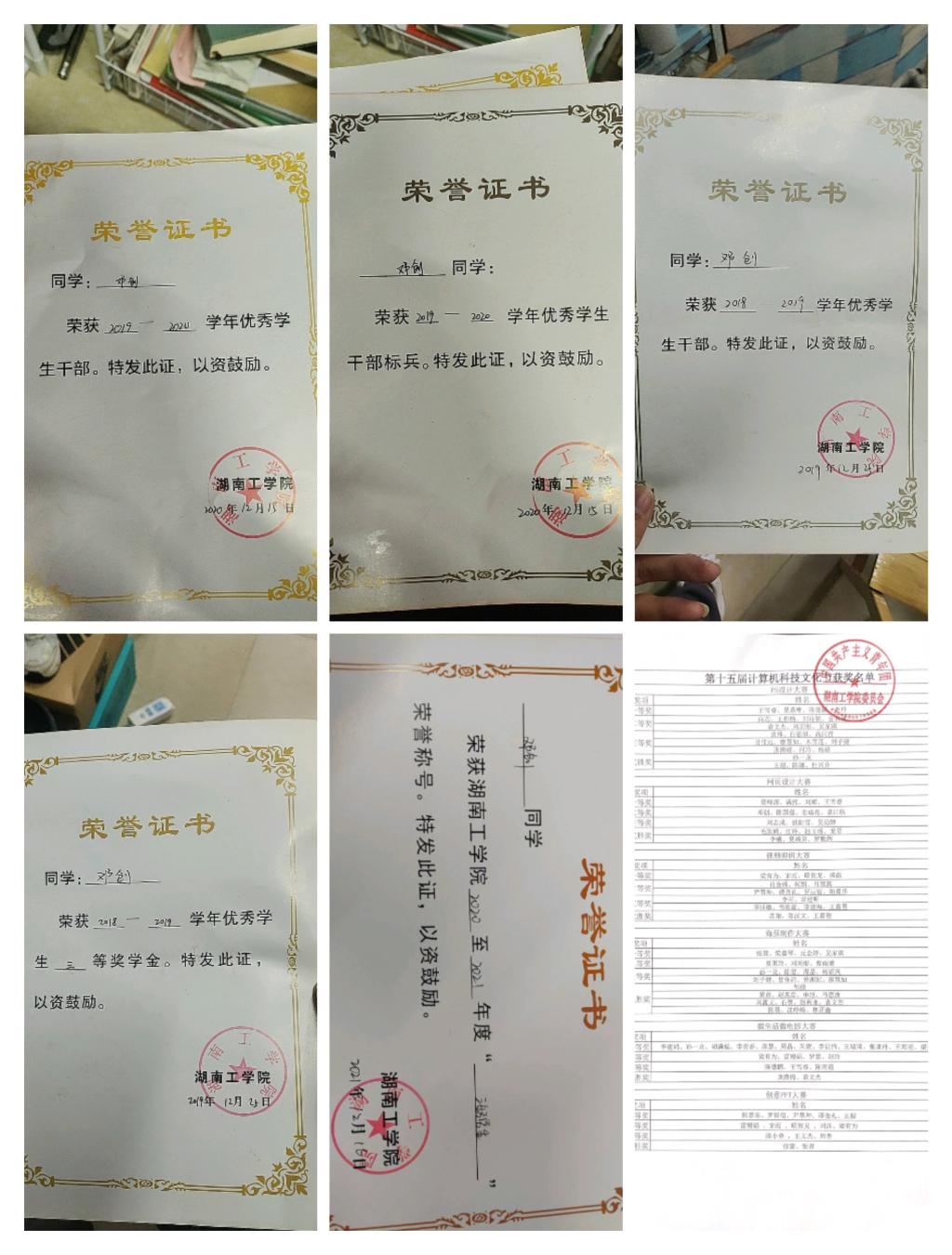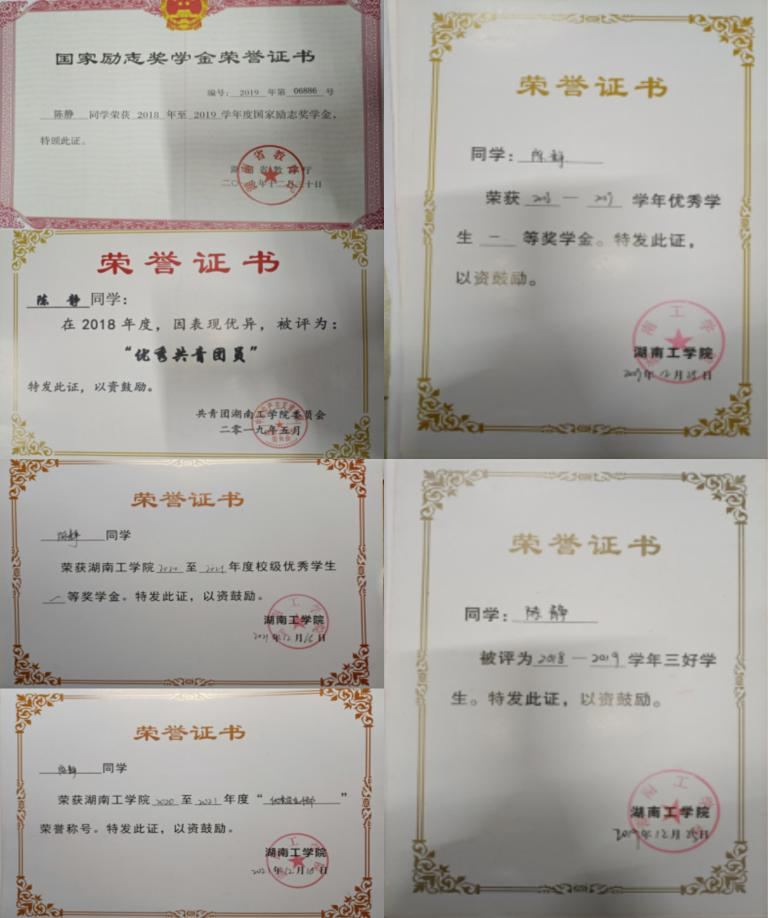 在校期间获得国家励志奖学金、校级优秀学生二等奖学金三次、校级三好学生、优秀共青团员、优秀学员、一校一书征文三等奖、优秀工作者、科技文化节二等奖、衡阳市优秀志愿者等荣誉。
