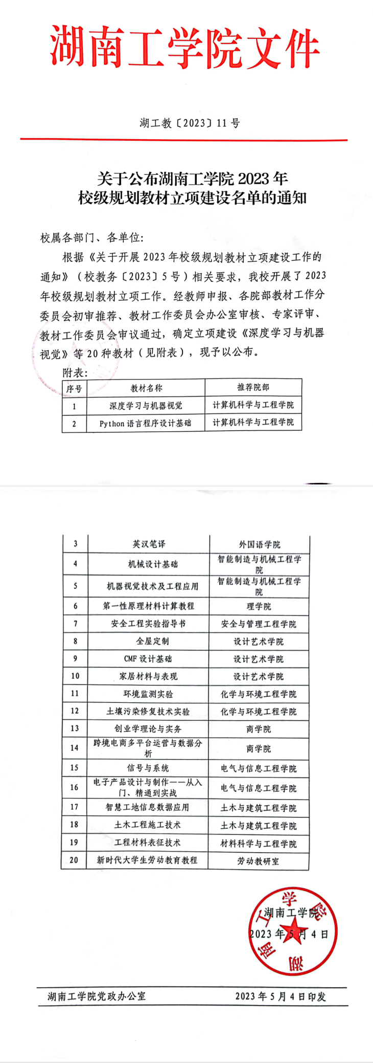 湖工教〔2023〕11号 关于公布beat365正版唯一官网必一2023年校级规划教材立项建设名单的通知