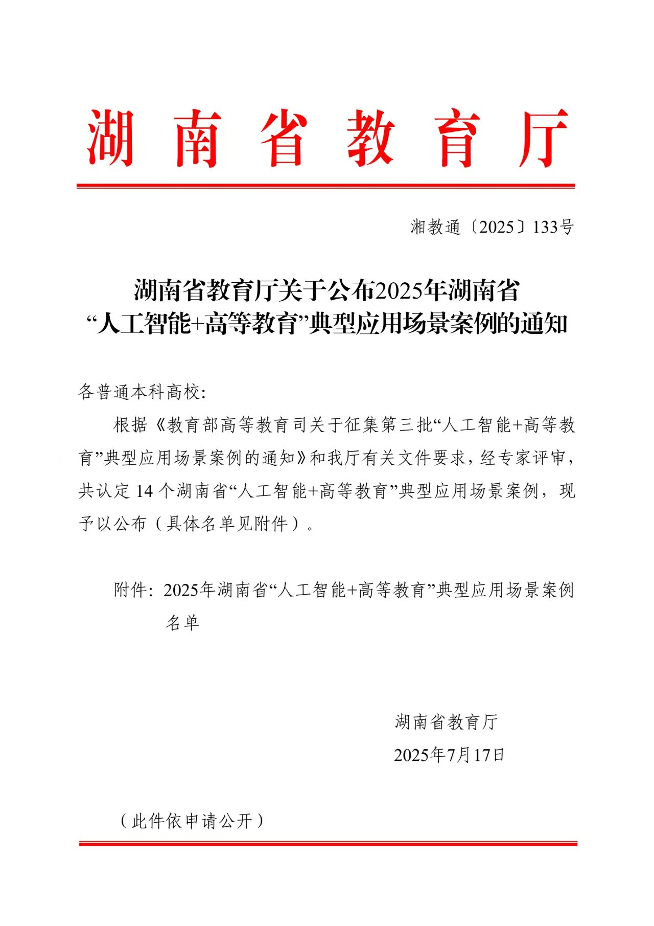 湖南省教育厅关于公布2025年湖南省 “人工智能+高等教育”典型应用场景案例的通知