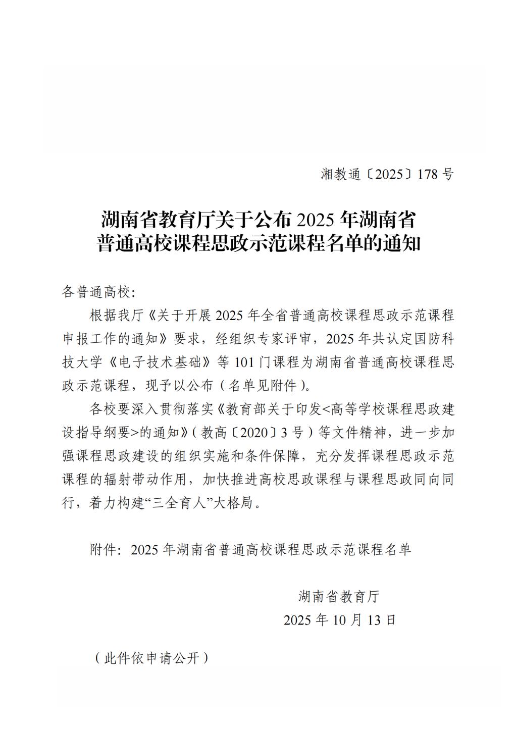 湖南省教育厅关于公布2025年湖南省普通高校课程思政示范课程名单的通知