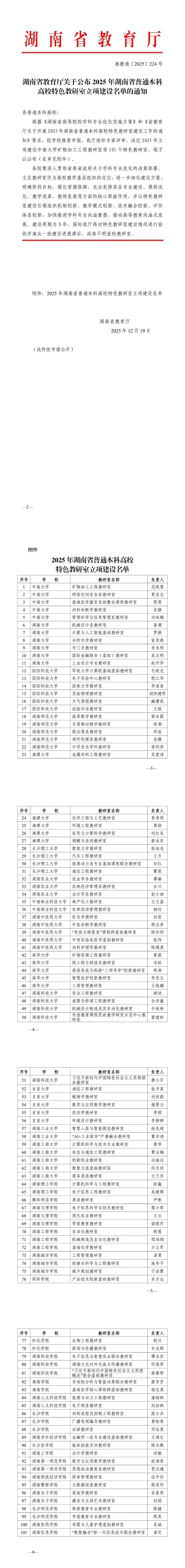 湖南省教育厅关于公布2025年湖南省普通本科高校特色教研室拟立项建设名单