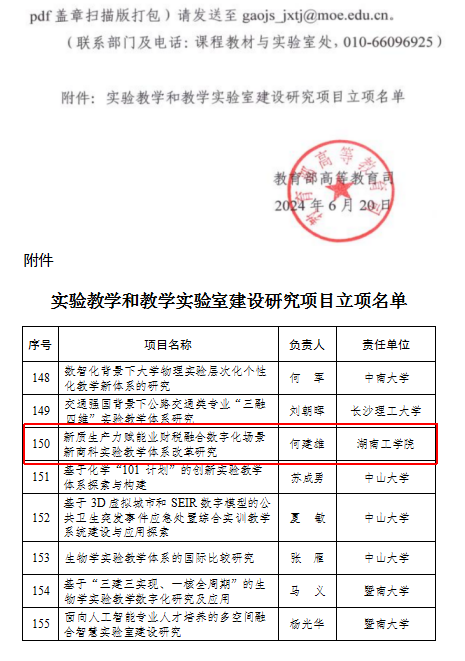 近日,教育部高等教育司发布了关于公布实验教学和教学实验室建设研究项目立项名单的通知,此次全国共批准234项,我省获批7项,学院层次仅有11所获批。由何建雄教授团队申报的“新质生产力赋能业财税融合数字化场景新商科实验教学体系改革研究”获得立项。