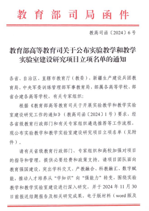 实验教学和教学实验室建设研究项目是教育部高等教育司2024年3月新推出的一类项目,主要围绕实验教学和教学实验室建设开展深入研究,该类项目面向教育强国建设,突出学科交叉、产教融合、科教融汇、数字赋能,推动学校人才培养从“学知识”向“强能力”转变。