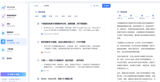 信息时代,每个学生的需求都是个性化的,因此,基于学生个性化的资源检索与推荐就显得非常重要。我们的资源检索功能可以根据学生输入的内容推荐相关的视频、论文以及其他公开网站的资源,进一步扩大知识的覆盖面。