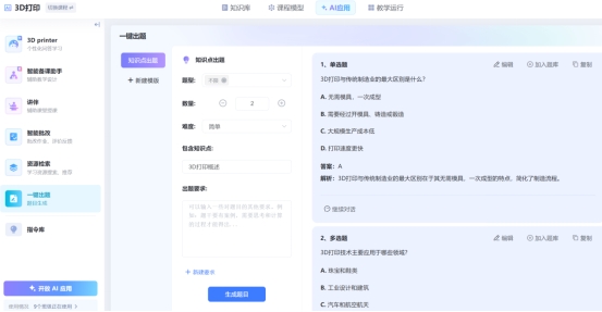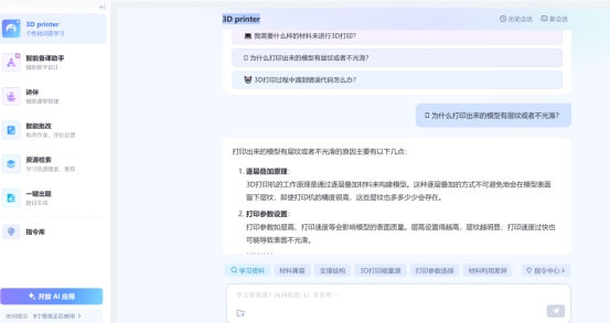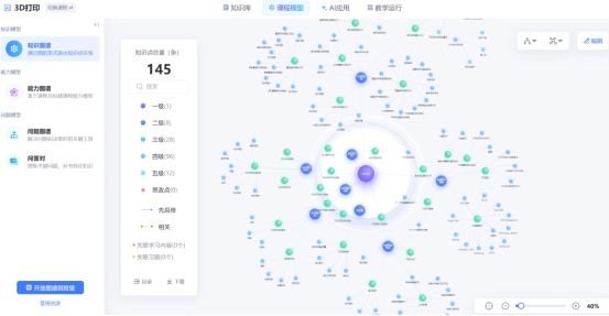 《3D打印》AI课程接入DeepSeek后,依据课程知识库生成课程资源地图后,课程团队基于课程的实际教学需求及课程特色,整合学习资源,总结课程内容,形成145个知识点在内的五级知识图谱,并将知识点与视频、试题、教材等相关联。学生可以依托知识图谱开展漫游式、自主式学习。同时,学生在学习过程中也可与AI进行互动,进一步提升学习体验。