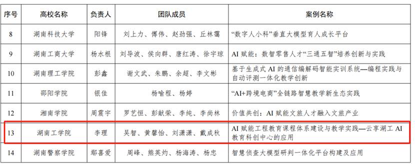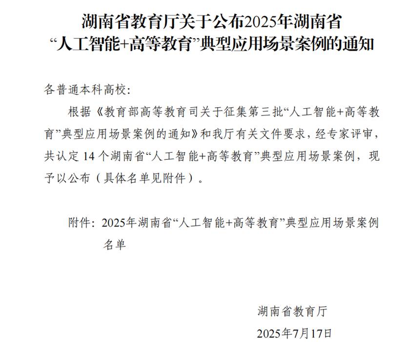 近日,湖南省教育厅下发了《湖南省教育厅关于公布2025年湖南省“人工智能+高等教育”典型应用场景案例的通知》,beat365官网教务处处长李理教授团队撰写的“AI赋能工程教育课程体系建设与教学实践——云享湖工AI教育科创中心的应用”被认定为湖南省“人工智能+高等教育典型应用场景案例”,今年湖南省共认定14个典型案例。这个案例是beat365官网被湖南省认定的首个典型案例,同时被湖南省推荐参评教育部典型案例。