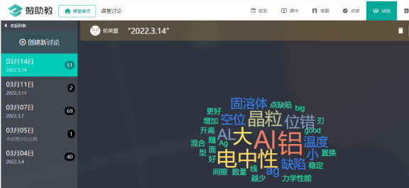 教师在课前在QQ学习交流群布置学习内容及任务、重难点,并提供教学的课件等资源,让学生可以在课前预习,保证课堂学习的效率和质量。课程中,教师直播上课的同时,可以利用微助教直播弹幕、发言版及"讨论"版块与学生广泛互动,充分了解学生的掌握情况。教师每讲解完一个重点问题,及时提问,学生通过弹幕讨论参与回答,高材20级学生课堂互动讨论总计1000余次。课程设计了53个课堂测试题目,涵盖课程的重点知识。通过课堂测试,可以即时了解学生的掌握情况,教师进行针对性的讲解。整个教学过程做到即时了解学生的情况,因材施教,充分互动,大大提高了学生的学习积极性。