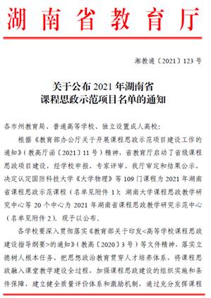 日前,湖南省教育厅下发了《关于公布2021年湖南省课程思政示范项目名单的通知》(湘教通〔2021〕123号),beat365官网何建雄教授主持的《会计学》和张一夫副教授主持的《流体力学》两门课程成功立项。