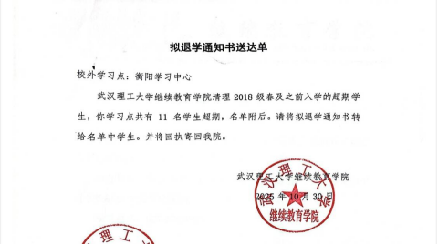 我学习中心部分远程网络教育学员的学习时间已超过武汉理工大学最长学习年限7年,按照武汉理工大学的相关文件予以退学,现将武汉理工大学继续教育学院拟退学通知书转发给你们,请高度重视,特此通知。