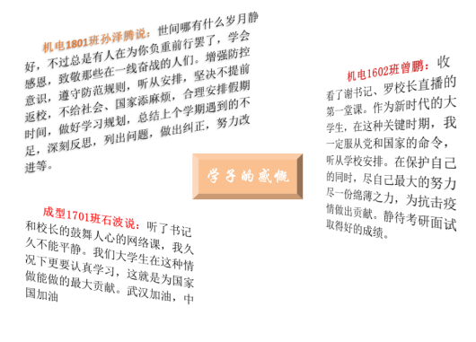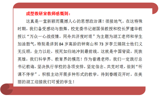 我院全体师生、部分家长、校友及关心湖工发展的同仁观看了直播课程,课后,师生反响热烈,纷纷结合自身工作学习实际,谈感受,谈触动,谈希望。