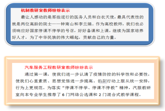 今天,机械学院全院师生共同聆听了由校党委书记谢国保和校长罗建华主讲的开学第一课,这是振奋人心的一堂课!校长罗建华分别从坚定信念,共克时艰,思想行动受洗礼;理性认识,避免恐慌,坚决打赢心理战;服从命令,听从安排,抗击疫情做贡献三个方面做了详细解说,并对本学期教学计划做了周密安排。党委书记谢国保用朴素而又细腻的语言讲述了青年大学生所应该担当的责任!乌云遮不住升起的太阳,疫情挡不住春天的来临;你若安好便是晴天!这是两位长者对全院师生的期待和祝福!