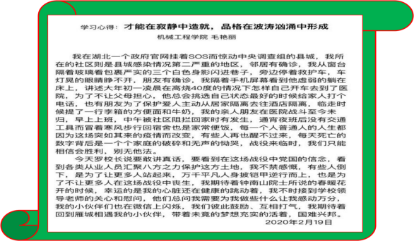 来自疫区教工毛艳丽老师发来的观后感: