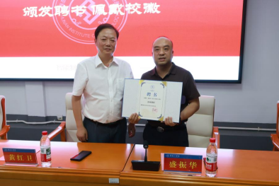 校党委委员、副校长黄红卫为盛振华校友佩戴校徽,颁发beat365正版唯一官网必一客座教授聘书。