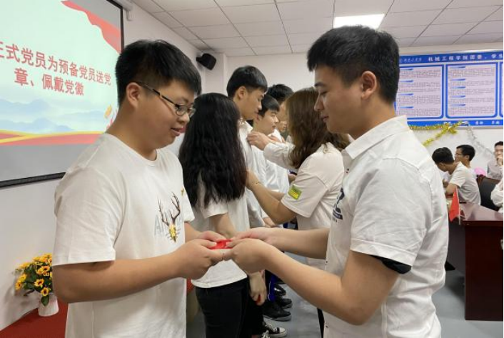 为预备党员赠一本党章、佩戴一次党徽,红色精神代代相传。正式党员为新一批发展的预备党员赠送党章,佩戴党徽,通过这种以老带新、薪火相传的方式激励党员时刻警醒自我、规范言行、服务群众、奉献社会。