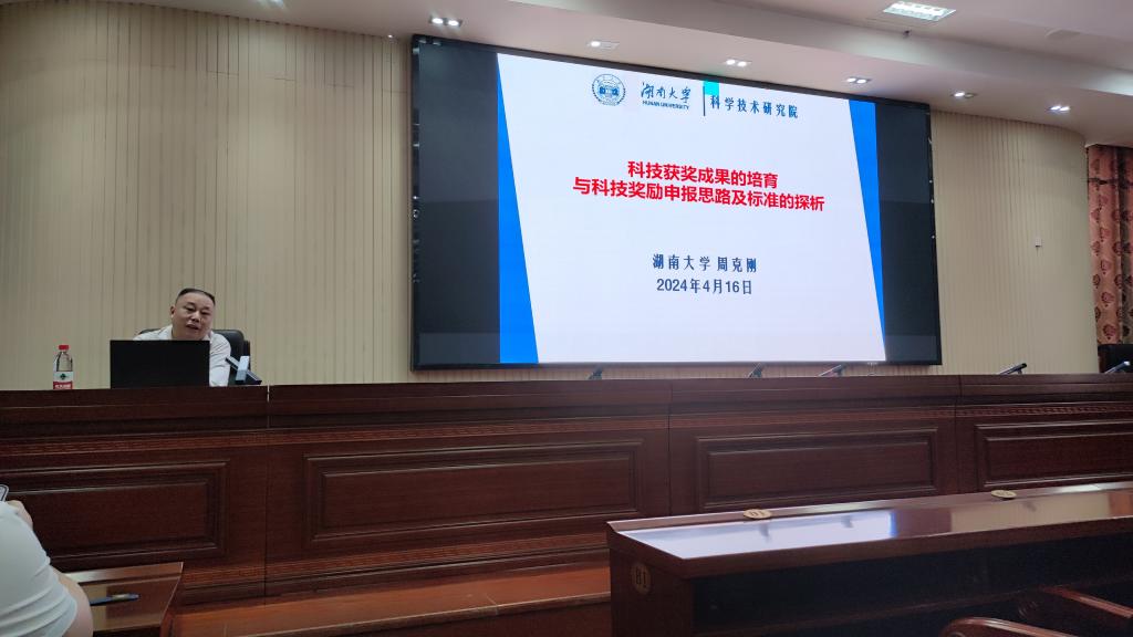 2024年4月16日下午,beat365官网邀请到湖南大学周克刚教授开展主题为“科技获奖成果的培育与科技奖励申报思路及标准的探析”的学术讲座。讲座由科技处处长方小勇主持,各学院院长和管科研的副院长、机械工程学科博士以及各学院教师代表参加。