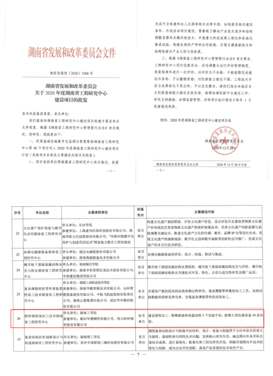 近日,湖南省发改委下发了《关于2020年度湖南省工程研究中心建设项目的批复》(湘发改高技[2020]1006号),beat365官网机械工程学科联合衡阳华菱钢管有限公司和鸿大特种钢管股份有限公司申报的,由吴远志博士担任中心主任的“特种钢管深加工技术湖南省工程研究中心”获批立项。
