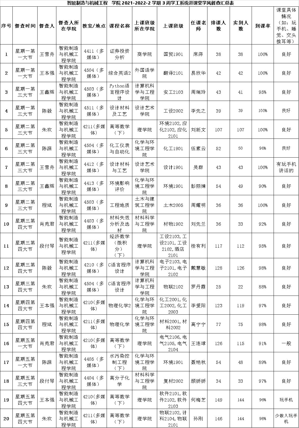 智能制造与机械工程学院2021-2022-2学期第3周学工系统进课堂学风督导情况
