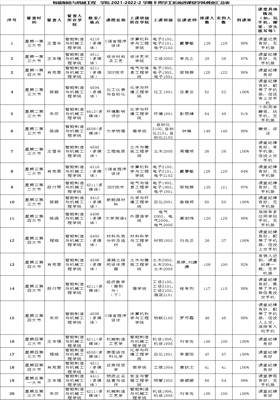 智能制造与机械工程学院2021-2022-2学期第9周学工系统进课堂学风督导情况