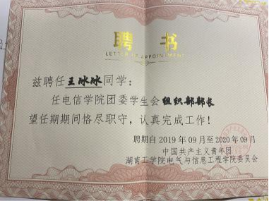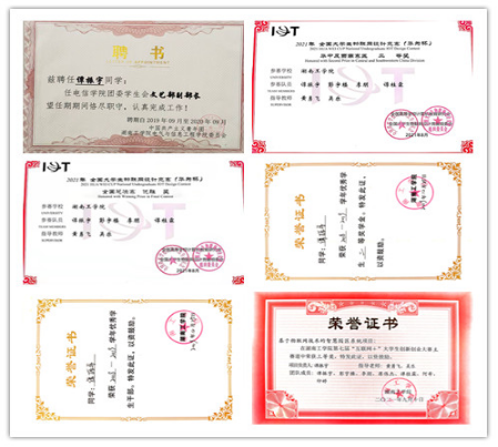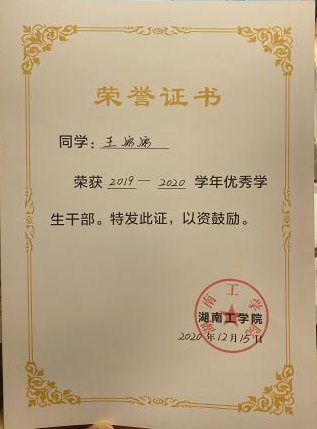 在校期间获评国家奖学金、国家励志奖学金、校一等优秀学生奖学金、校三好学生、校三好学生标兵、优秀共青团员、优秀共青团干部等多项荣誉。参加CaTICs网络大赛并获得CAD团队赛一等奖和CAD职业证书二级;加入雁鸣合唱团期间荣获beat365正版唯一官网必一新生军训歌咏比赛二等奖;参加湖南省全国大学生成图大赛荣获个人全能一等奖,参加第十四届“高教杯”全国大学生成图大赛获得个人全能二等奖;暑假期间,参加家乡青年志愿者活动荣获独塘乡抗疫志愿活动“最美志愿者”称号。