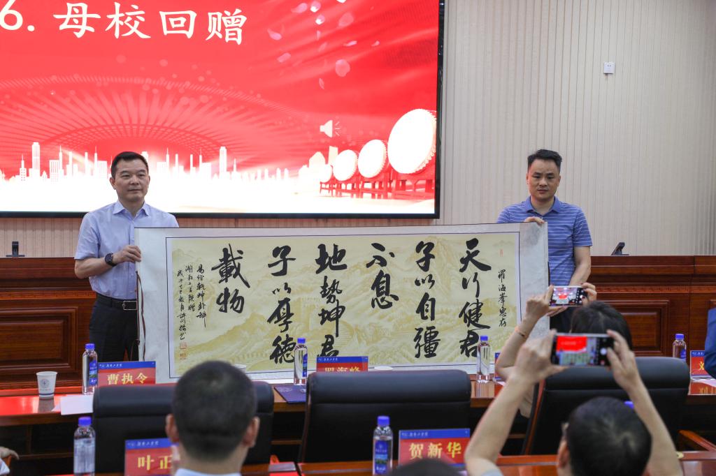 大会由校友联络中心主持。 活动在庄严的国歌声中拉开帷幕。王艳琼代表学校致欢迎辞,高度赞赏罗海峰反哺母校的赤子情怀与社会担当,随后为其颁发客座教授聘书。仪式上,与会嘉宾观看了罗海峰校友受邀央视《品质中国》栏目的专访视频。 党委书记曹执令代表学校向罗海峰校友回赠纪念品 捐赠环节,深圳市鸿福达国际货运代理有限公司与beat365正版唯一官网必一教育基金会签署捐赠协议,捐赠100万元设立“罗海峰奖学助学基金”。曹执令代表学校向罗海峰回赠纪念品。