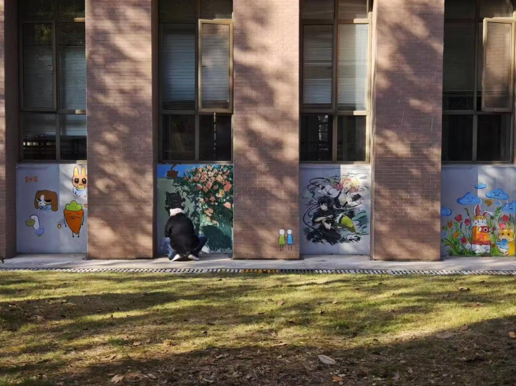 结合建工楼独特的建筑风格与空间布局,党支部精选多处代表性角落作为彩绘区域,并设计了一系列贴近青年、寓意深刻的彩绘元素。如小白兔拔草浇水传递团队协作的温暖力量;章鱼哥的幽默表情营造轻松氛围;尼克与朱迪携手展现团结互助精神;环保地球彩绘则呼吁践行绿色生活理念......同学们充分发挥专业特长与设计创意,将朴素墙面转化为一幅幅生动壁画在创作中交流思想、增进情谊,以实际行动 践行“青春化党建”模式。