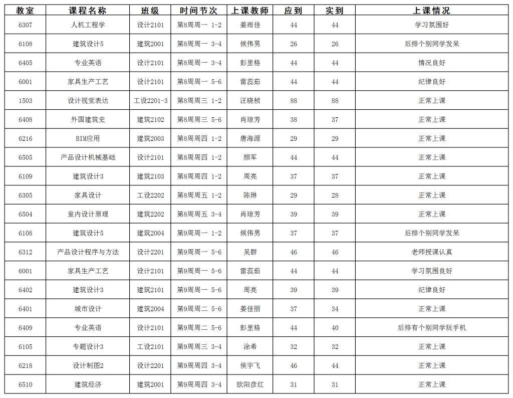 第8-9周我院各项教学活动正常开展。学院继续保持日常教学检查力度,对我院所有教师和学生上课进行例行检查。