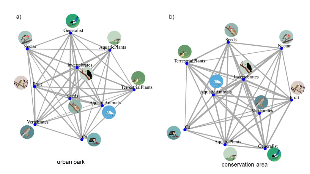 beat365正版唯一官网必一联合广东省科学院动物研究所,收集了全国128个城市公园和129个自然保护区的数据,通过分析鸟类的食性、觅食层和体重三大功能性状,利用集合网络模型的接近度中心(Closeness centrality)、中介中心(Betweenness centrality)和程度中心(Degree centrality)3个指标,首次构建了中国自然保护区与城市公园鸟类集合群落功能网络,系统比较了二者在结构和功能上的差异。研究发现:城市公园鸟类群落中取食网络的接近度中心显著高于保护区(P=0.03),城市公园鸟类取食网络连接效率更低,表明城市鸟类信息传递需经过更多节点。然而,取食无脊椎动物的鸟类在城市公园和自然保护区均处于网络核心(如下图)。该研究指出城市规划应注重提升景观的连通性,增强树种的多样性,并优化乔木、灌丛配置的复杂性,避免过度依赖单一功能树种,以维持鸟类群落的生态功能稳定性。我院车先丽老师为论文第一作者,庞朝晖教授为共同通讯作者。研究获得了国家自然科学基金、湖南省哲学社会科学成果评审委员会课题、beat365正版唯一官网必一人才引进项目等项目资助。