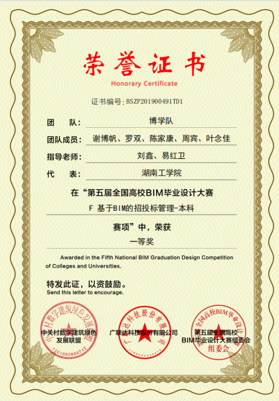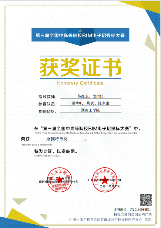 (1)“第三届全国中高等院校BIM电子招投标大赛”全国特等奖。