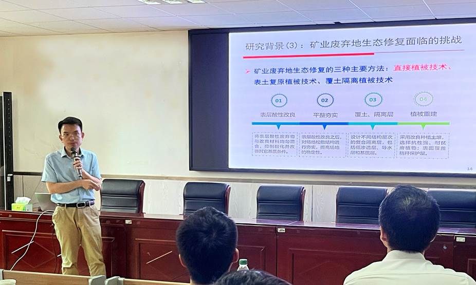 李金天教授系统阐述了中国矿业废弃地治理的现状与挑战。他指出,我国矿业废弃地面积广阔,且多与人口密集区、粮食主产区和生态脆弱区重叠,对生态安全和人体健康构成严重威胁,然而,长期有效的生态修复技术相对缺乏。针对这一瓶颈,李教授分享了团队相关科研成果:揭示驱动磷循环的关键微生物,阐明植物多样性在矿山修复中的作用及机制,发现矿山环境中的抗生素抗性基因污染及其控制原理。成功构建了重金属矿业废弃地生态修复的直接植被技术体系,推动了生态修复技术应用。在随后的互动环节中,师生们围绕“植物物种配置对矿区修复效果的影响”等议题与李教授展开了热烈而深入的探讨。李教授特别强调了“微生物—植物—环境”协同治理的跨学科研究价值,为在场师生提供了新的研究思路和视角。