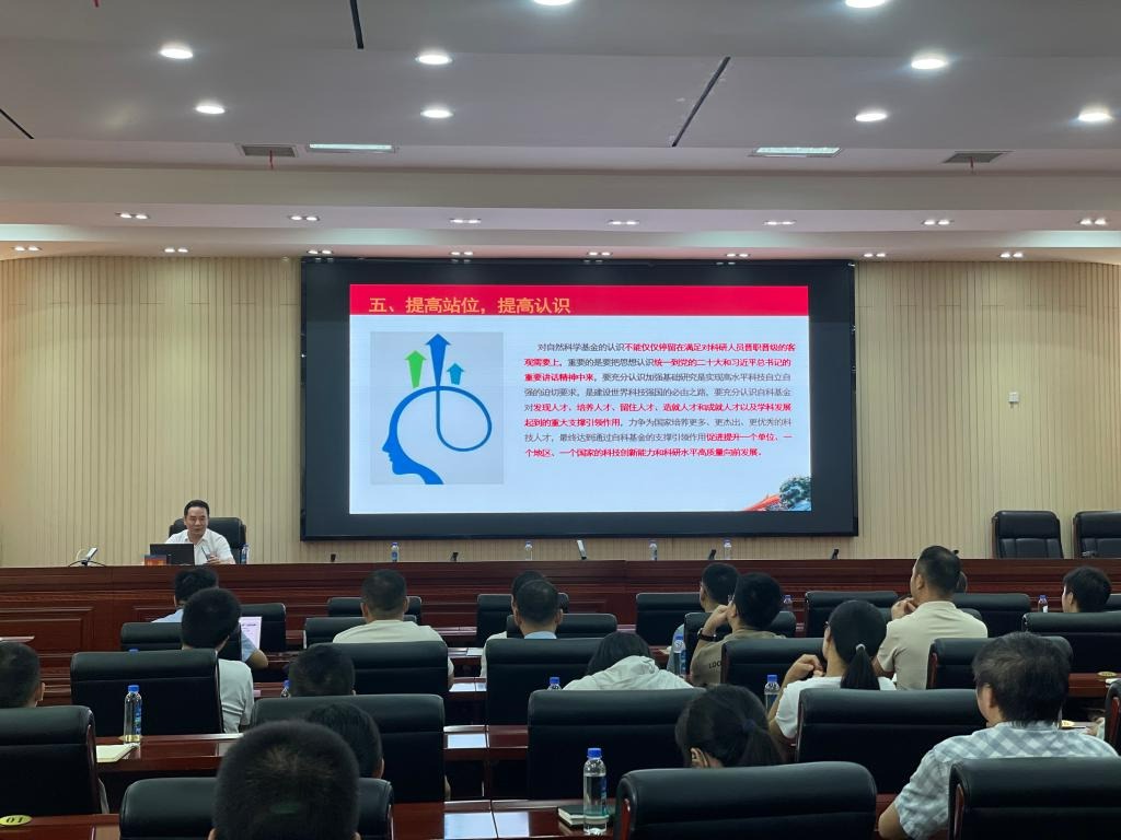 杨剑主任作了一场提振士气、鼓舞干劲的申报动员报告。他以《切实加强自然科学基金工作,夯实我省科技自立自强根基》为题,结合自身多年从事科技工作的实践经验与切实体会,从“了解基金作用,提高站位认识”、“抓住历史机遇,珍惜平台岗位”、“加强沟通协调,提早规划布局”、“工作再接再厉,成绩再创辉煌”等四个方面展开讲解,既有对宏观政策的解读,也有对近三年我省自然科学基金工作成果的分析,且以涌现出的科研先进个人为例证,强调在科研创新道路上,一要“坚定信心,敢打必胜”,二要“自强不息,战斗不止”。