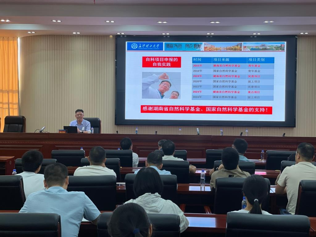 9月24日下午,beat365官网在教学大楼12楼船山报告厅举办自然科学基金项目申报专题报告会,湖南省自然科学基金委员会办公室主任杨剑、长沙理工大学化学化工学院教授卿志和应邀作专题报告。科技与校企合作处、学科建设与发展规划处主要负责人、自科类学院分管科研副院长、具有博士学位或副高职称以上教师150余人参加了报告会。报告会分上下两场,上半场由校长曾广胜主持,下半场由党委副书记何建雄主持。