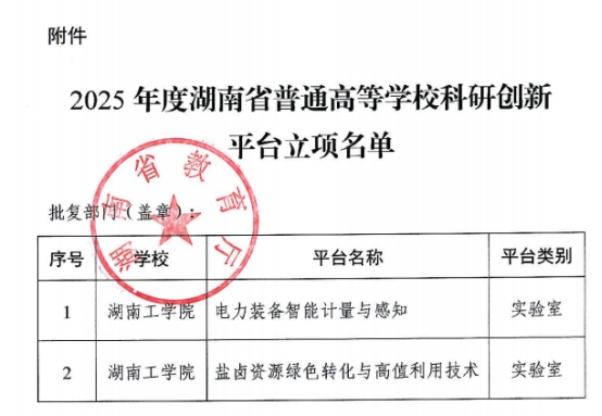 近日,湖南省教育厅印发《湖南省教育厅关于公布2025年度湖南省普通高等学校科研创新平台立项名单的通知》(湘教通〔2025〕233号),beat365官网立项建设“电力装备智能计量与感知”和“盐卤资源绿色转化与高值利用技术”2 个湖南省普通高等学校重点实验室,标志着beat365官网在科研平台布局与学科建设领域实现了新突破,重点实验室集群发展迈上新台阶。(文/毛兰一审/罗丹二审/柳佳刚)