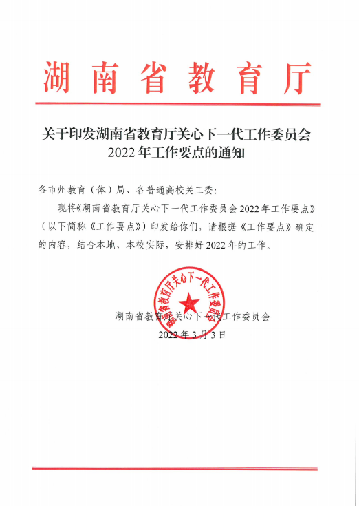 关于印发湖南省教育厅关心下一代工作委员会2022年工作要点的通知