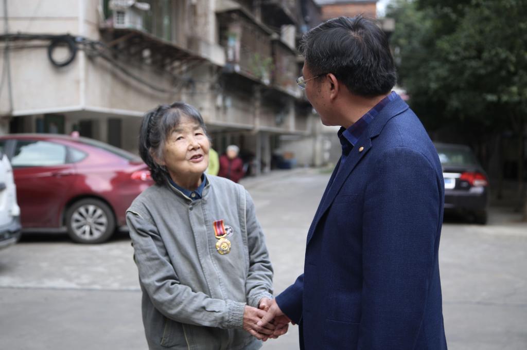 在秋日暖阳里,校领导与两位老同志分别握手并亲切询问他们的身体状况和生活近况,了解他们的所需所急,一起回忆那段战火纷飞的峥嵘岁月。